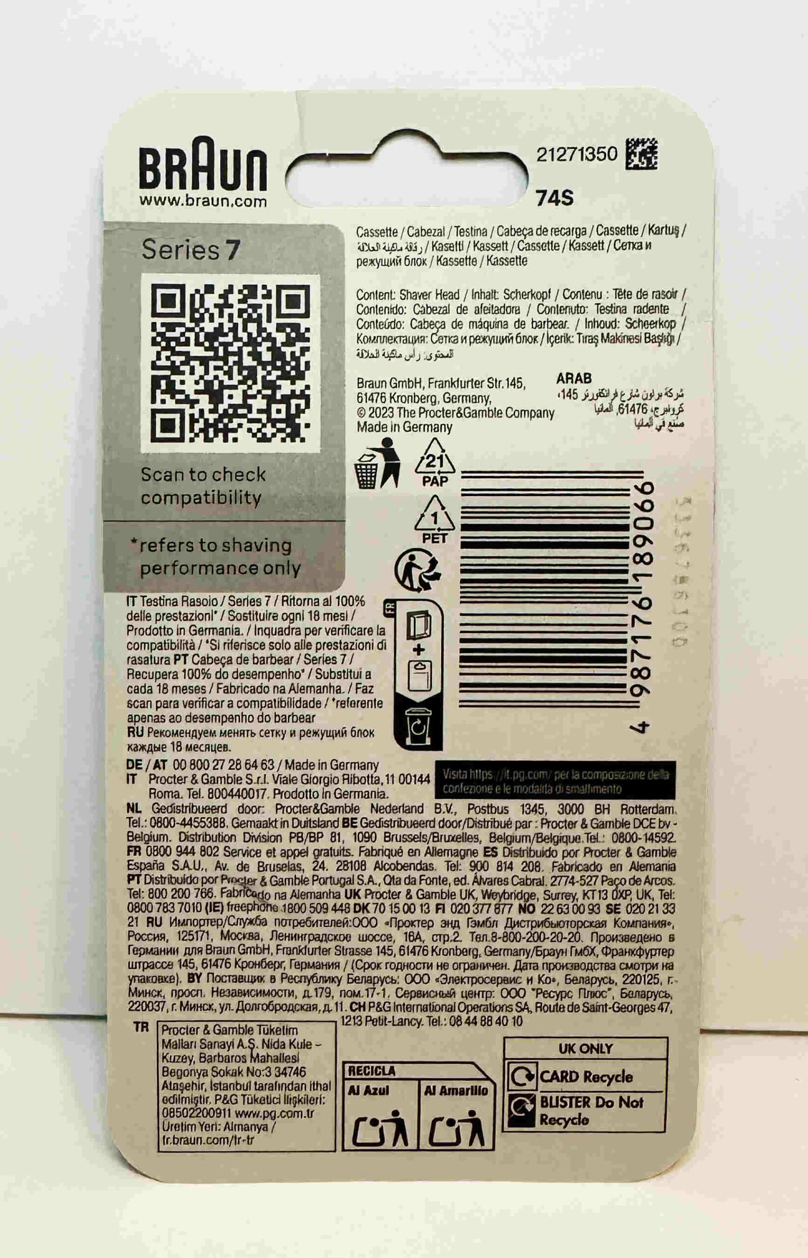 Braun 74S -vaihtoterä on suunniteltu Series 7 -sarjan -parranajokoneille. Siinä on 360° joustava SkinFlex-pää, joka mukautuu kasvojesi muotoihin, auttaen saavuttamaan haastavat kohdat kuten leukalinjan ja kaulan.